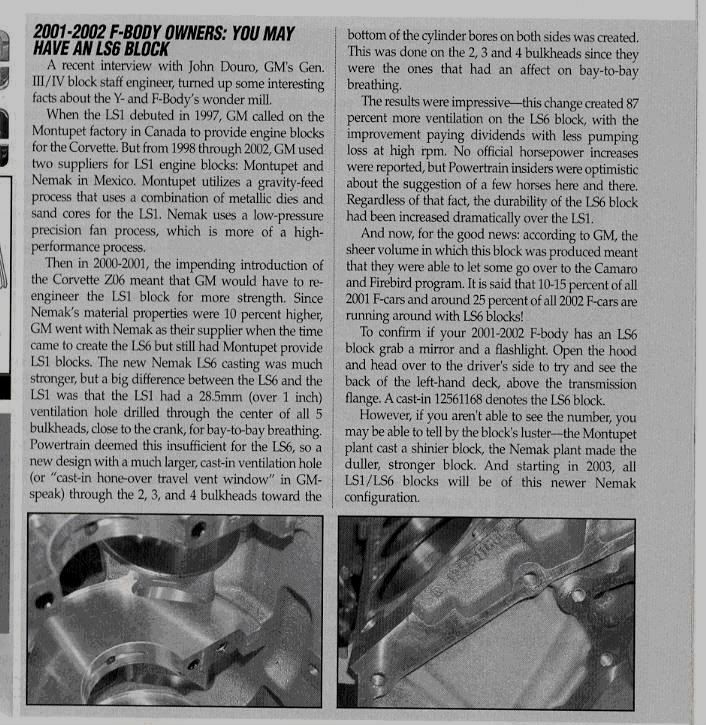 I have heard that some 2002 ws6 came with ls6 blocks because they ran out of ls1 and they are collectable. my ws6 is a 2001 and i heard that they did produce a few 01 ws6 with ls6 blocks. the numer of them is much less. How would i tell if it is. i am gessing the block serial number. Or is this story about ws6 having ls6 blocks not true. if anyone knows anyting about this i would like to know more about it.