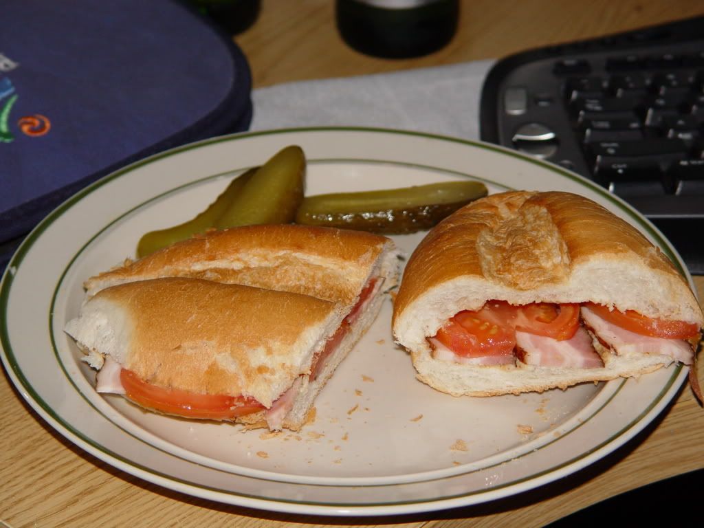 smoked bacon, spicy mustard and tomato on a bread with european style pickle on the side